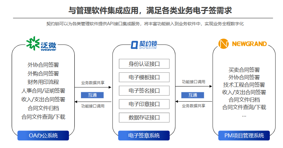 契约锁电子签章主要集成对接了中煤科工西安研究院现有的泛微OA、新中大PM系统,将电子签章等功能应用嵌入到客户现有的管理软件流程中,在合同制作、签署环节直接通过接口即可调用契约锁相关功能页面完成用户身份认证及合同电子签,已签合同自动回传管理软件中归档存储,随时可查。