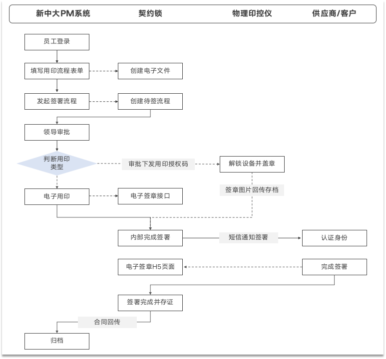④ 线下盖章的场景图片自动通过印控设备回传契约锁及PM系统存档。