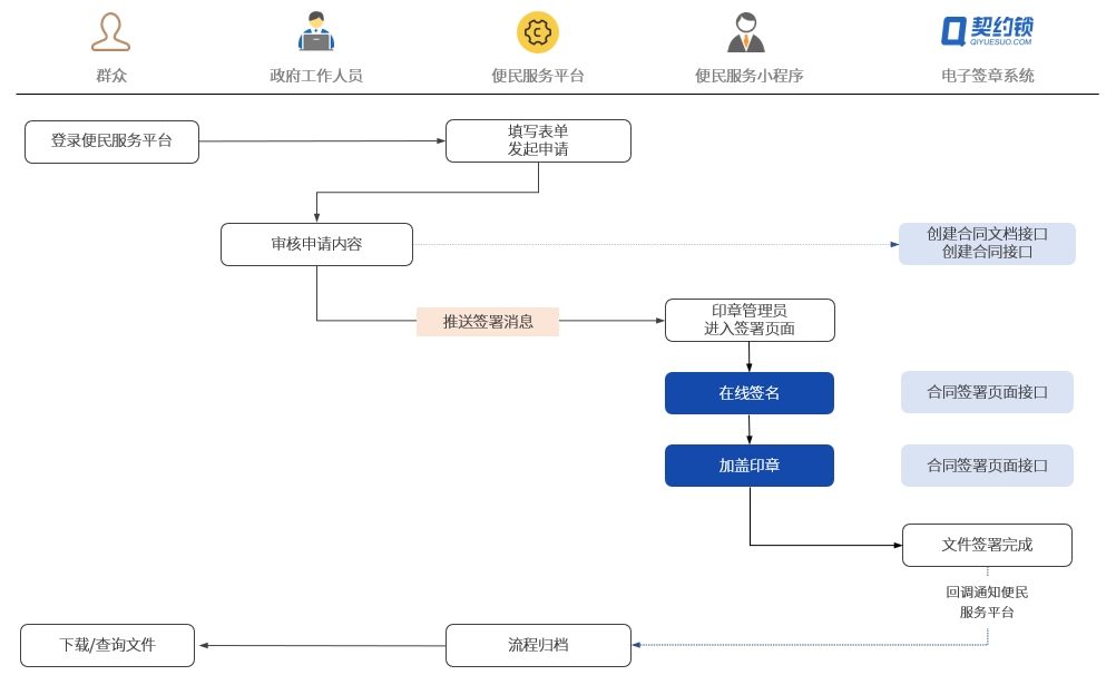 Integrate with convenient service platforms, mini programs, and other applications to provide electronic signature support for various types of certificates, introduction letters, and other frequently handled services by the public through existing service platforms, achieving online circulation and full digitalization of business processes.