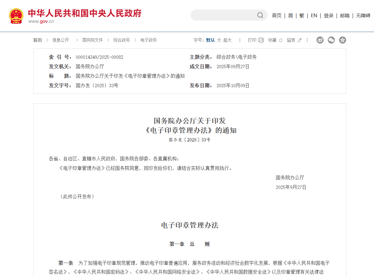 9月27日,国务院办公厅印发了我国首个国家级《电子印章管理办法》(以下简称《办法》),并于印发当日起实施。