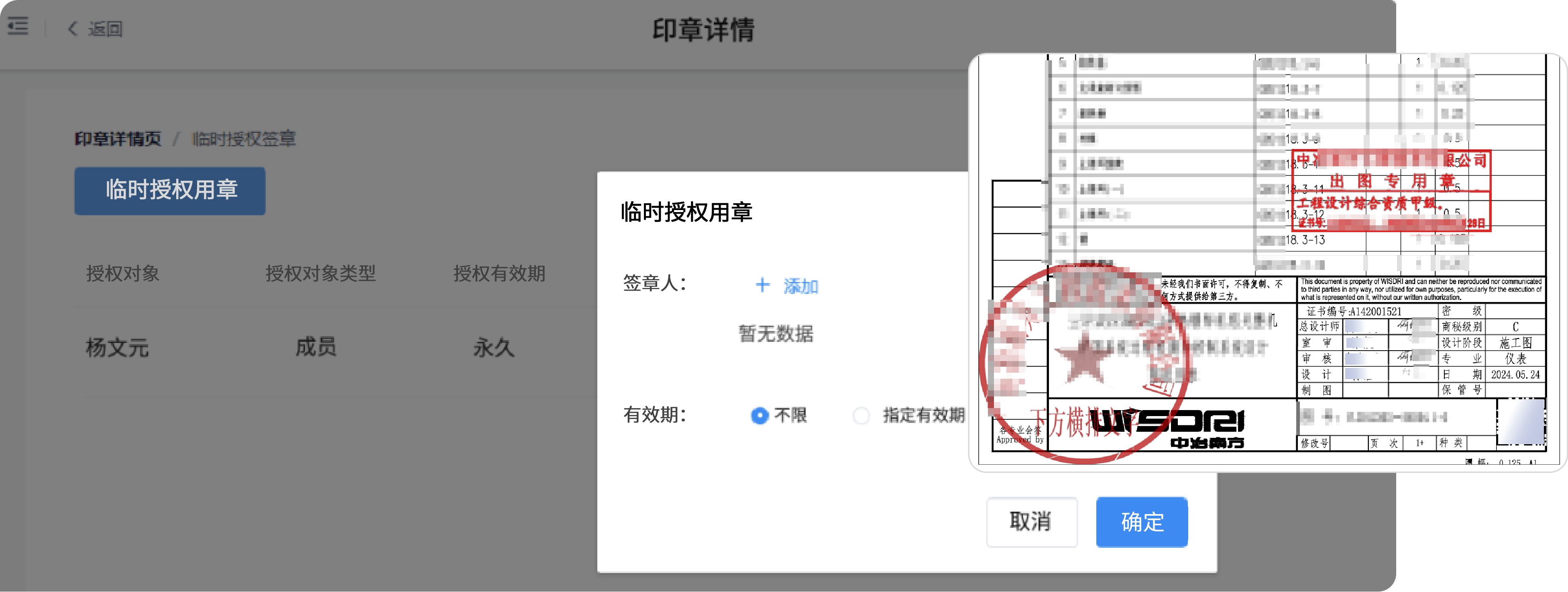 现在,直接将电子签章应用嵌入到中冶南方自研的工程项目管理系统中,实现图纸审批、流转、多方签字、盖章全面数字化。