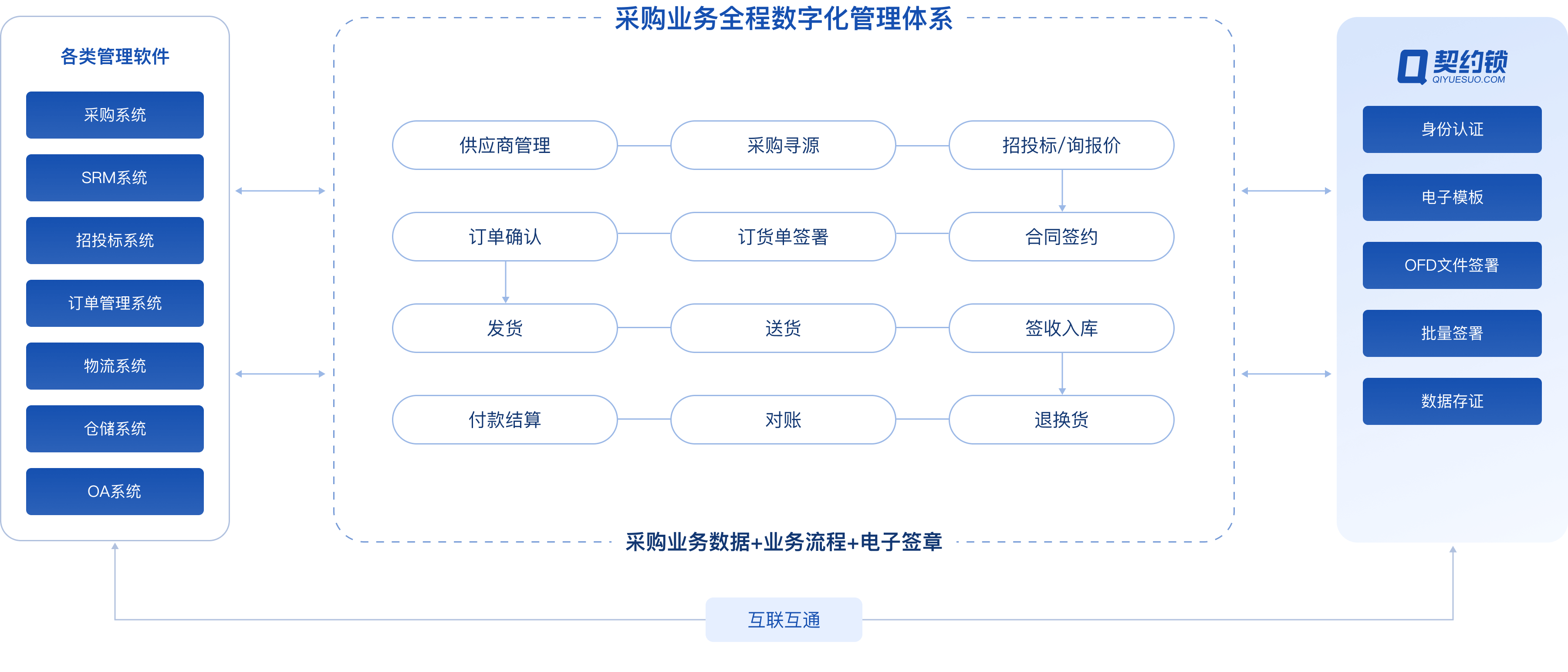 支持对接SRM、ERP、OA、订单系统、物流系统等各类软件,为采购全过程提供电子签约支持,推动询报价-招投标-合同签约-收发货-对账结算业务全程数字化。