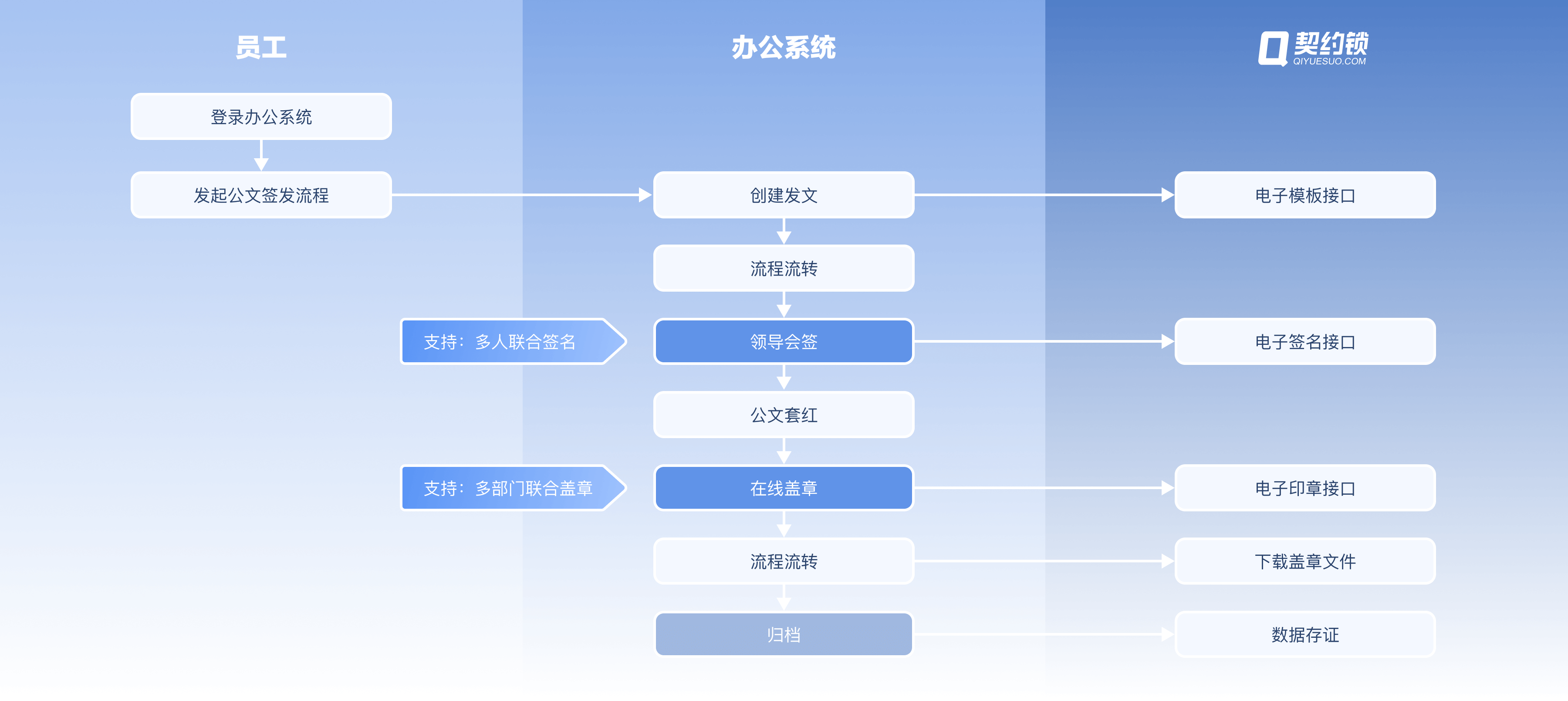 契约锁电子签章系统支持对接OA办公系统,为组织公文签发提供集“拟稿、会签、盖章、归档、查询”于一体的智能化公文服务。提升公文内、外流转效率,彻底改变组织无序、低效、麻烦的公文管理状态。
