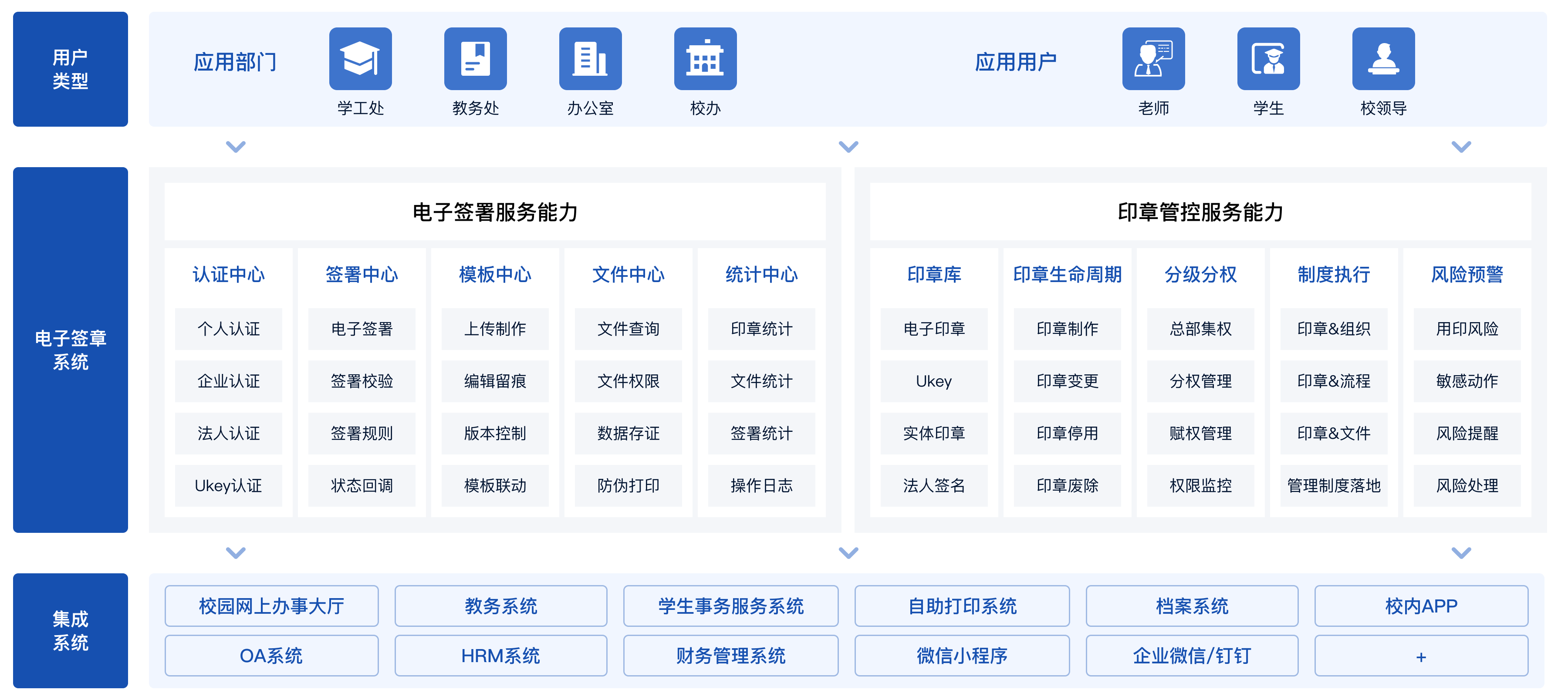 契约锁支持分级分权管理、具备强大的集成能力,让高校总校、分校、各院系一个平台用印;与各类教务软件集成,按需构建高校场景,无需重复部署,一套系统满足全校需求。
