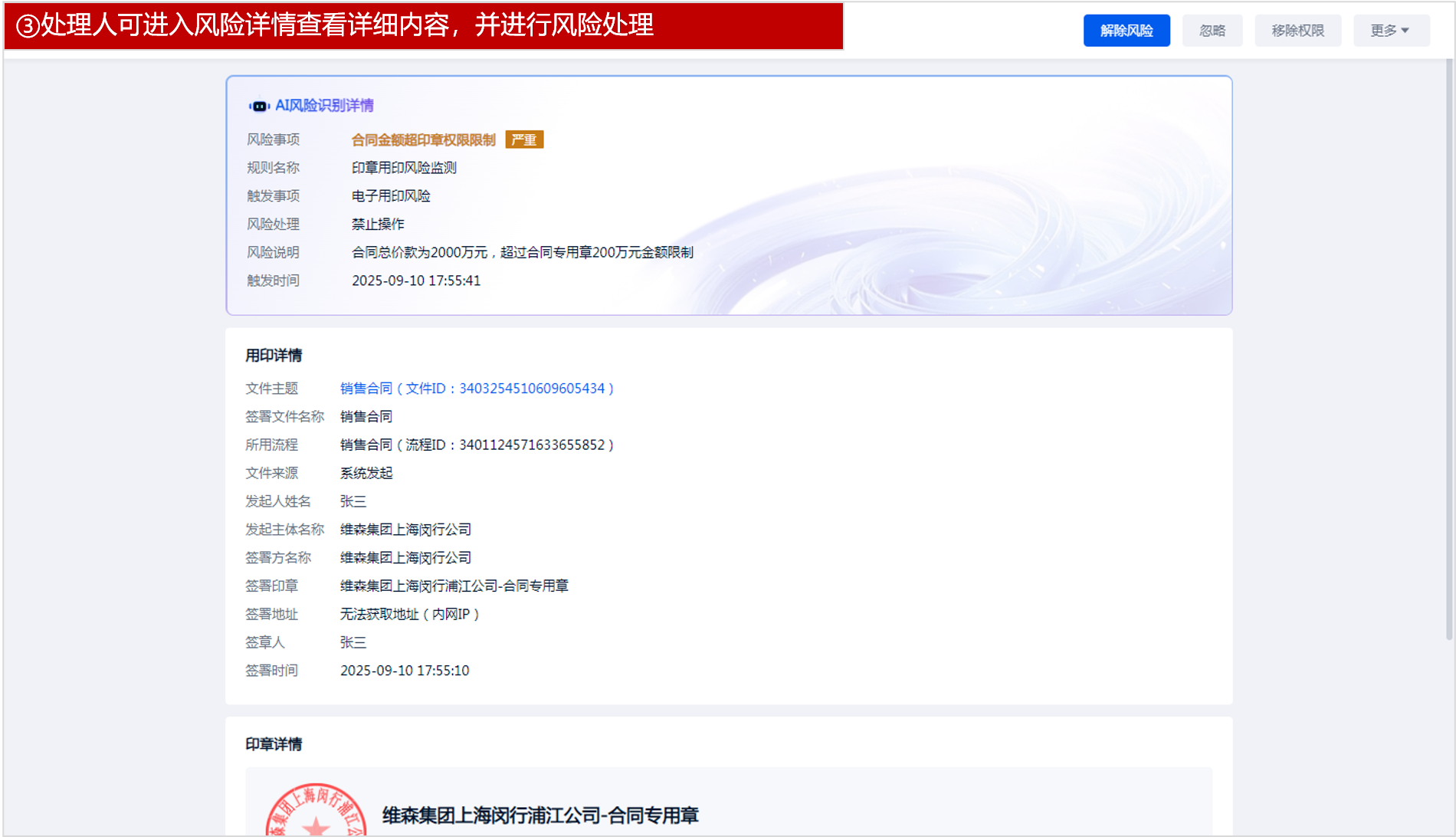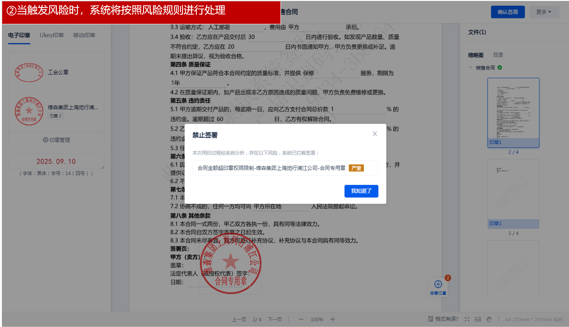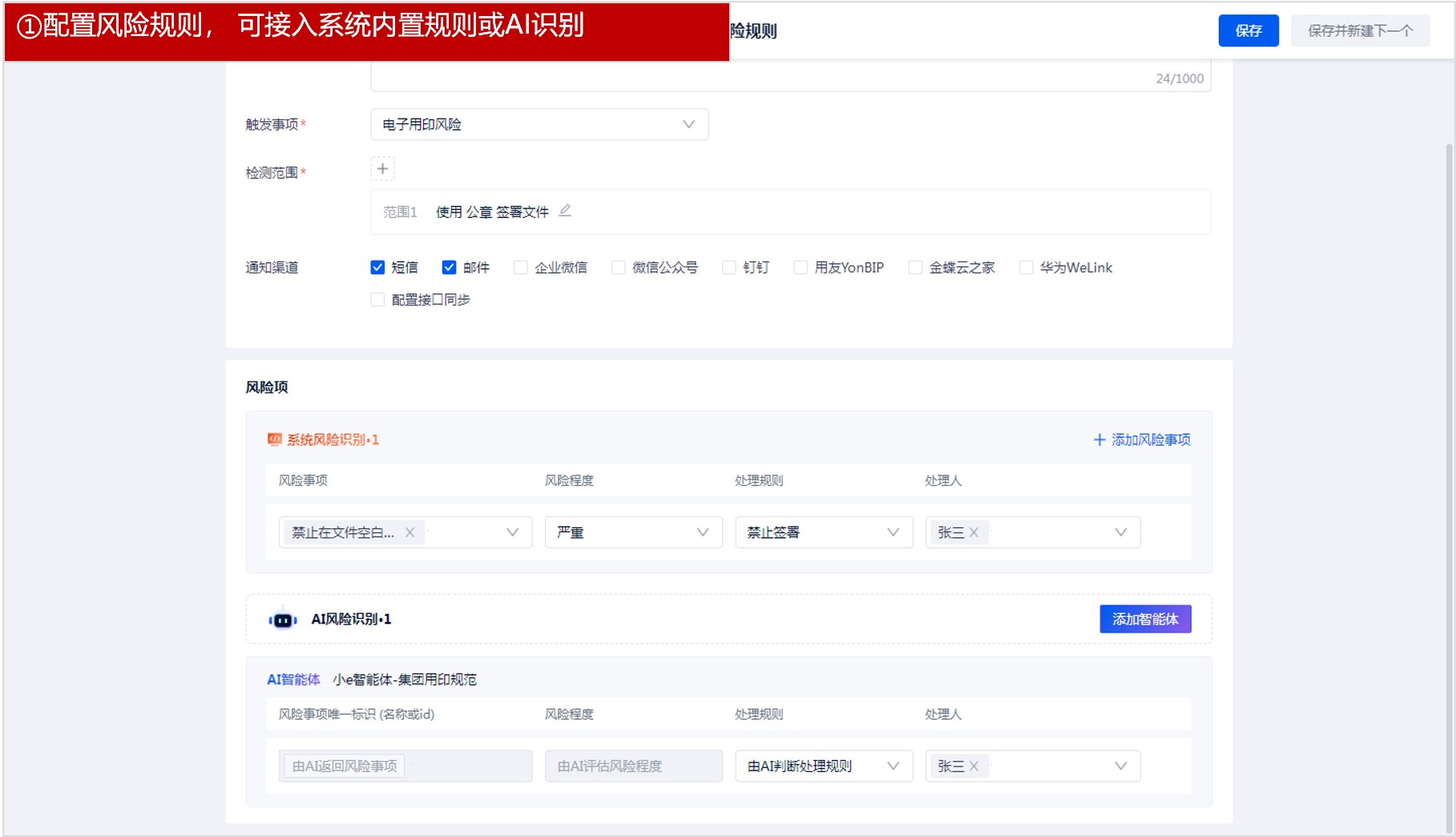 b、AI风险预警:本次新增支持通过AI 根据印章制度对用印时的文件内容和用印信息进行风险识别,若发现有问题可阻断签署。