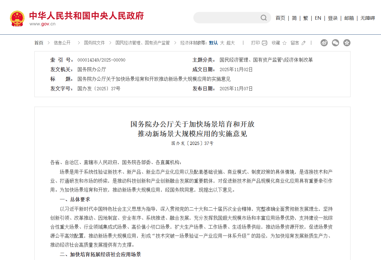 11月7日国务院办公厅印发《关于加快场景培育和开放推动新场景大规模应用的实施意见》,提出要充分发挥我国市场大、可应用场景多的优势,通过加快培育和开放各类应用场景,推动新技术、新产品实现大规模应用。