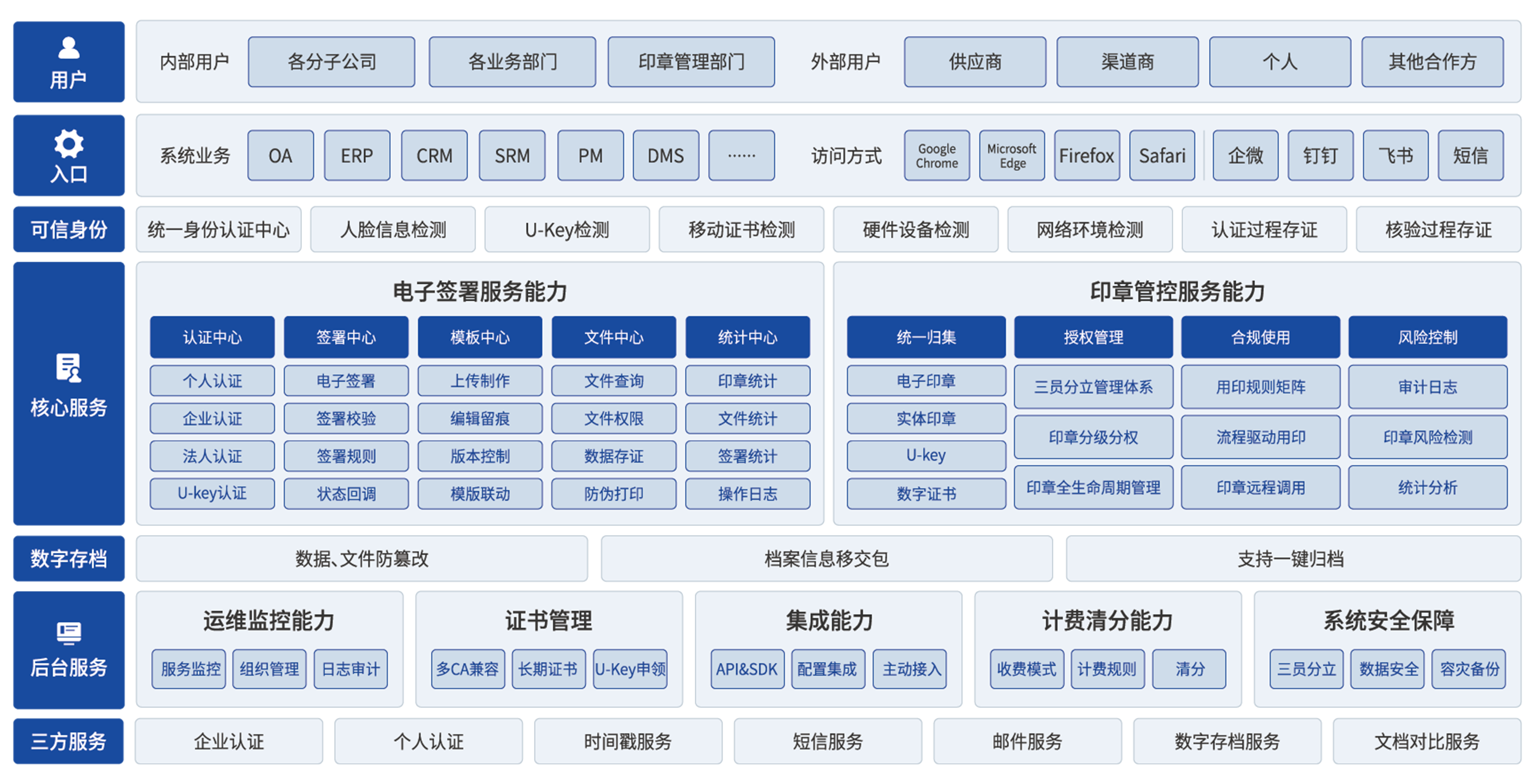 契约锁数字可信产品覆盖“身份认证及核验、电子合同签约云平台、私有化电子签章系统、开放集成平台、便携式UKey电子签章、轻量化网络签章工具、移动签章、印章管控平台、全链路数据存证等”多种类型,专注化解数字化转型过程中“用户身份辨认难、签署效力保障难、印章及数据安全管理难”等难题,契约锁支持API、SDK集成,中间表集成以及RPA集成技术,可以轻松接入各类管理软件,劳动合同、采购合同、招投标文件、销售合同、公文、成绩单、对账单、验收单、医院处方、银行保函及询证函、保险保单等上千种智能电子签署场景按需搭建。