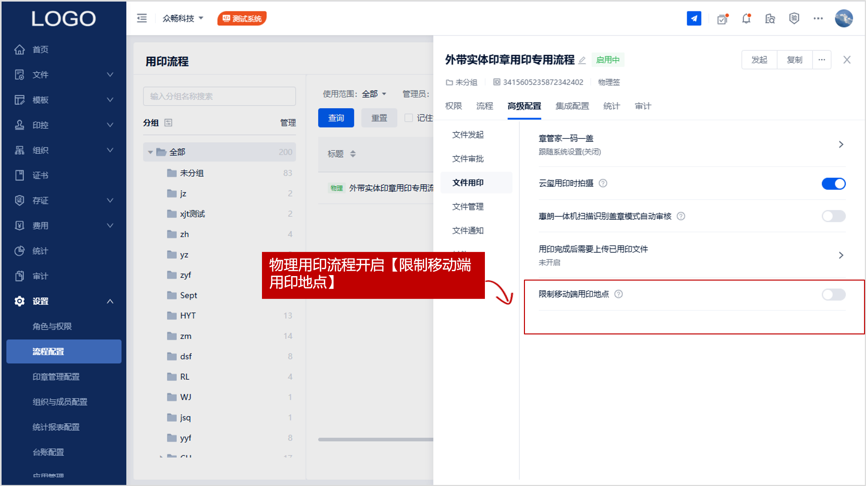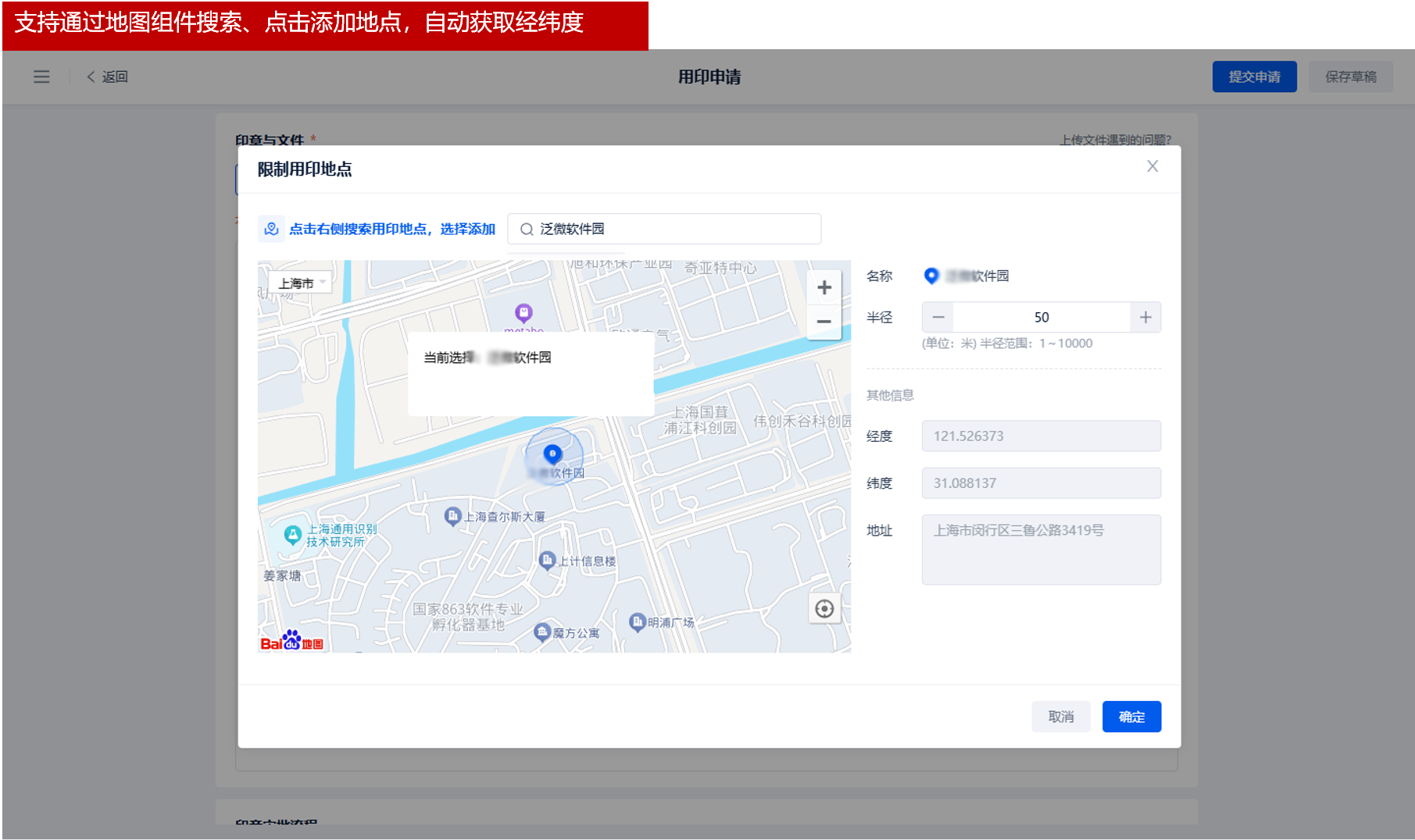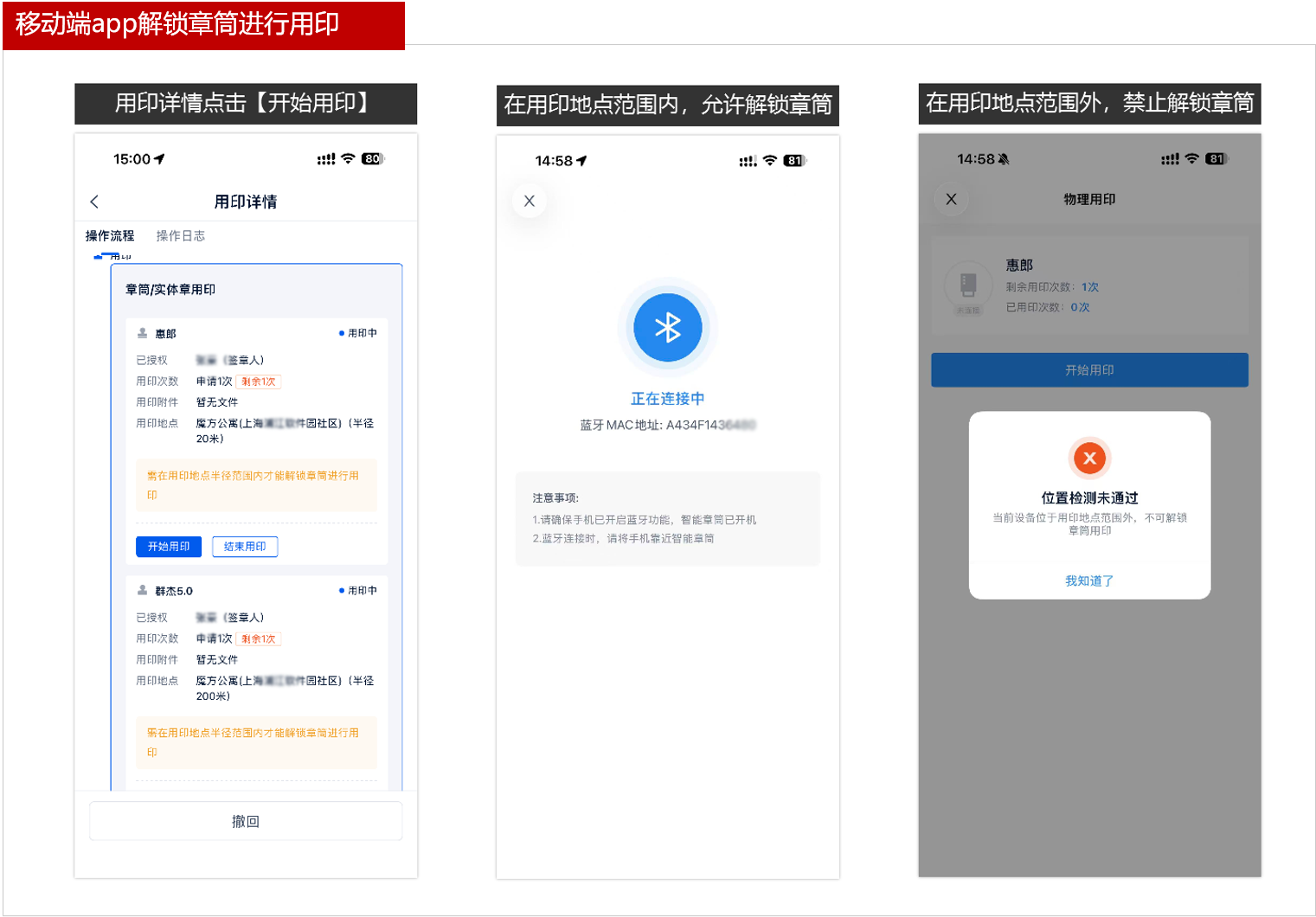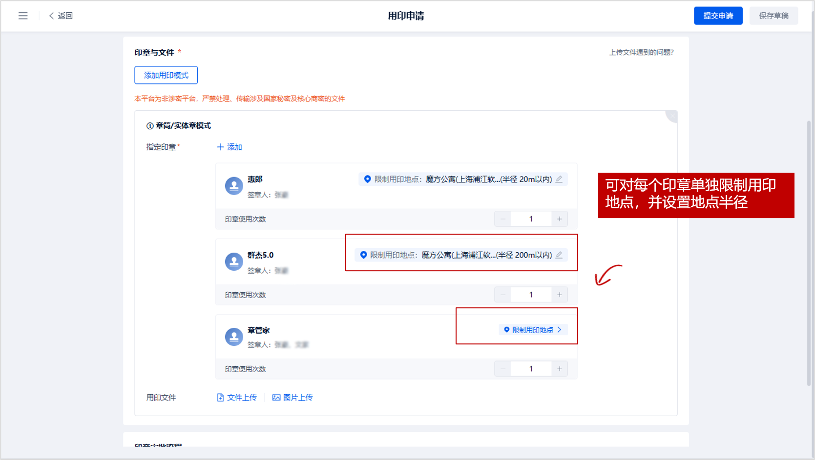 1.发起物理用印申请时,可对申请印章限制1个用印地点及半径,要求签章人仅能在指定的地点内解锁章筒进行用印