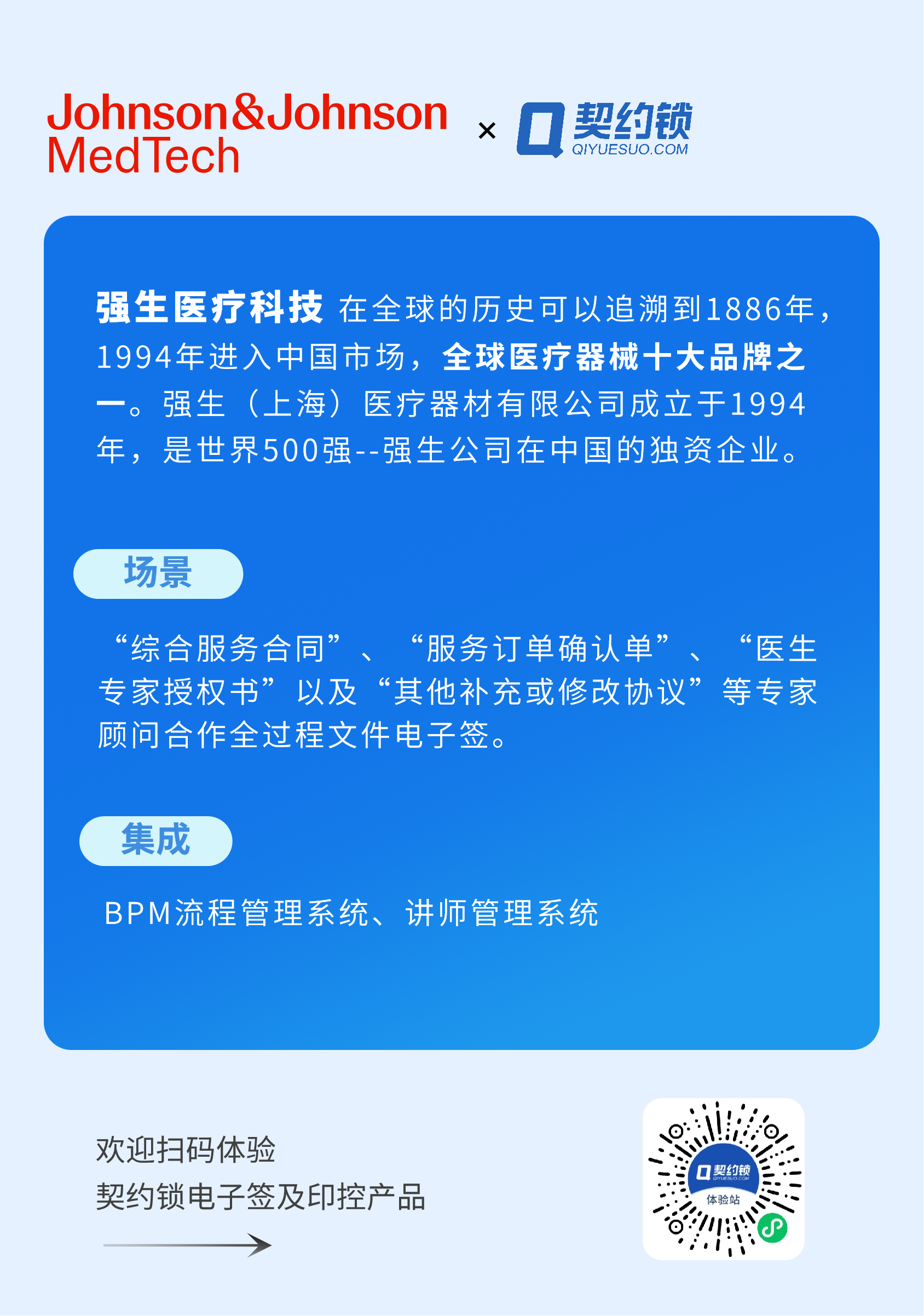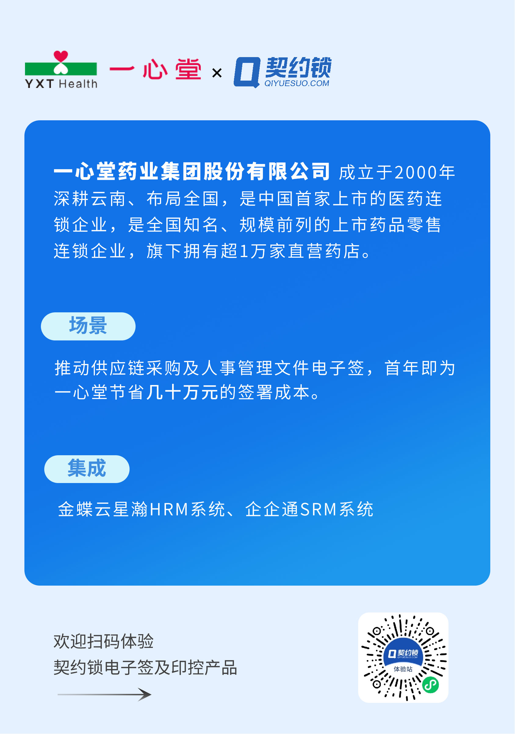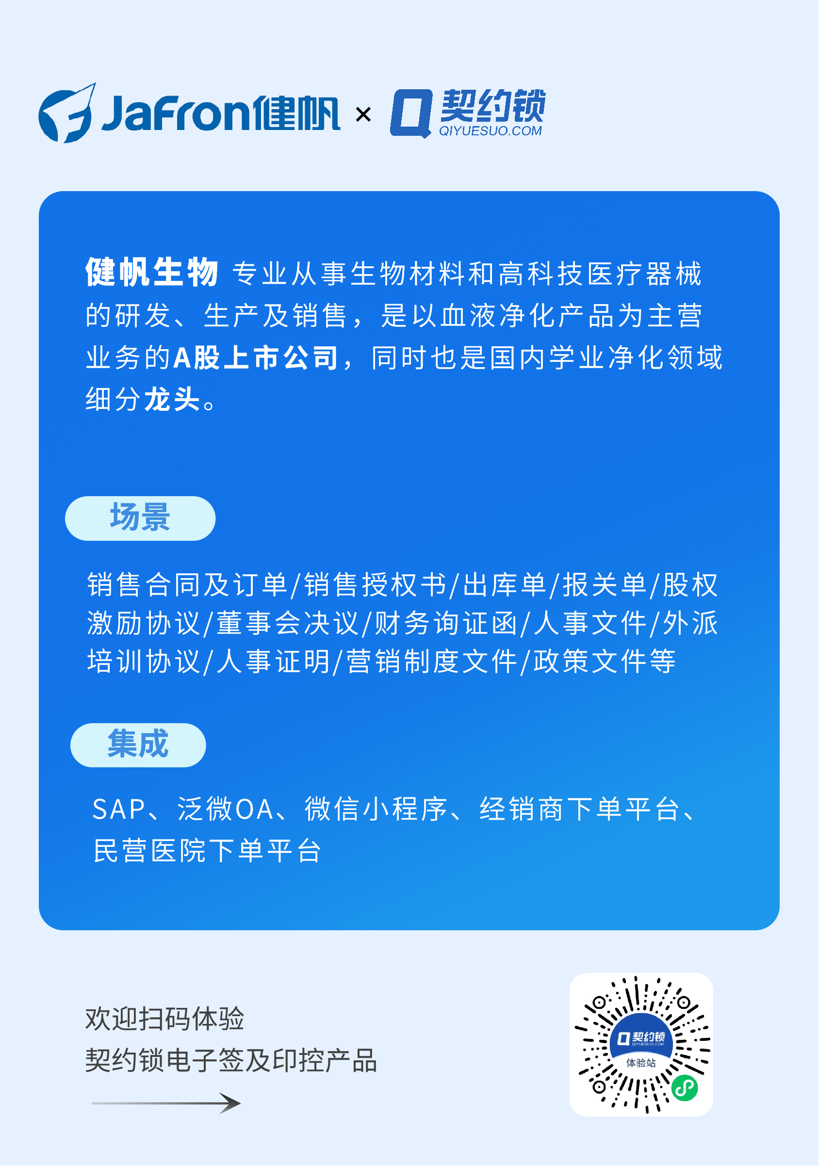 契约锁基于大量实践,场景方案可以随时在医药、医疗器械、医院、体检服务、互联网医院以及体检机构等医疗全行业场景中落地实现。