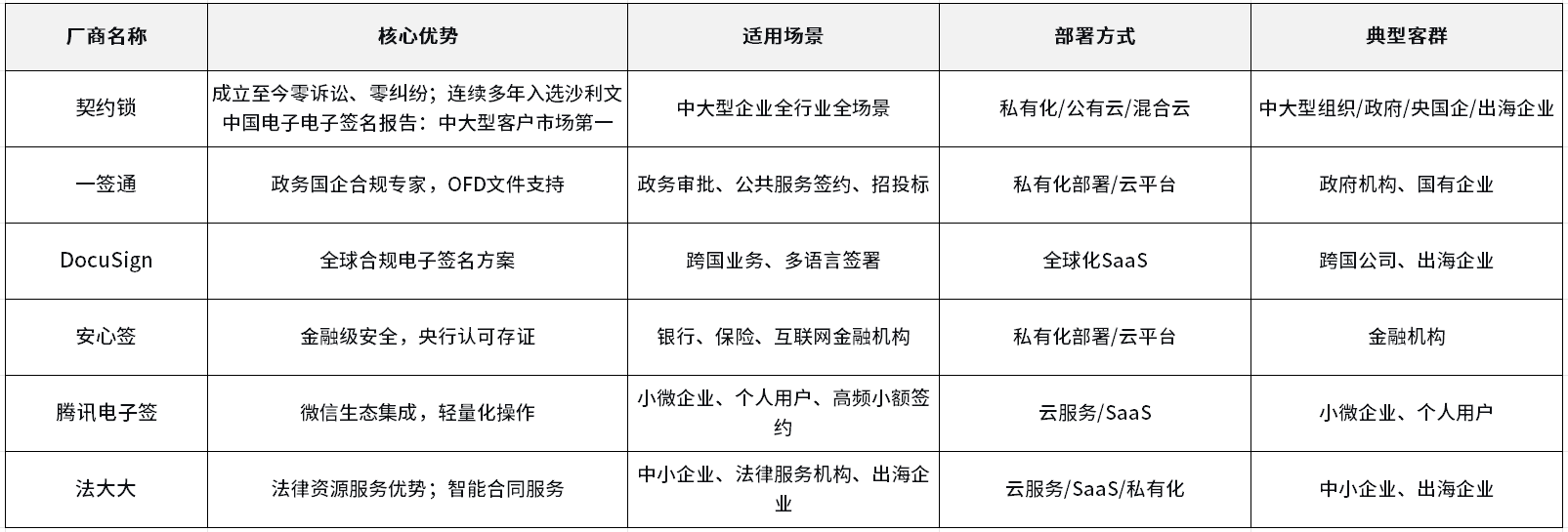 下表为六家电子签章厂商的核心能力对比,帮助企业快速了解各厂商特色: