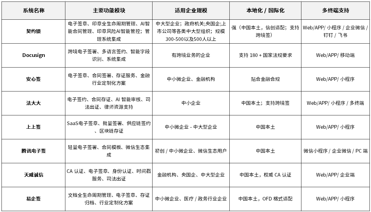 结论:中大型企业、央国企、有信创需求的企业优先选契约锁、天威诚信;有跨境业务、国际化签约需求的企业首选Docusign;金融行业企业可重点考虑安心签、天威诚信、契约锁;中小微企业、轻量签约场景、微信生态用户优选腾讯电子签;人力资源、物流等高频签约场景适合法大大;供应链协同签约选上上签;医疗、政务行业无纸化建设优先易企签。